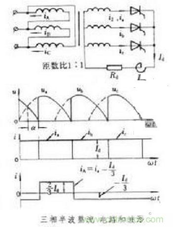 由圖可見,變壓器次級繞組電流i2可以分解成直流分量i2=和交流分量i。由於直流分量i2≈隻能產生直流磁通勢,所以它無法影響初級電流作相應變化。而交流分量 i將通過變壓器的磁耦合反映到初級電流中去。這樣,初、次級電流有效值分別為I1=Id/3、I2=Id/。在α=0°和不考慮電網電壓波動等情況下,得S2=1.48Pd、S1=1.21Pd、S=1.345Pd, 其中Pd為整流功率。在三相橋式電路中,次級無直流分量電流,所以初、次級電流是波形相同的交流電,故S=1.05Pd,可見橋式接線時變壓器利用率提高。