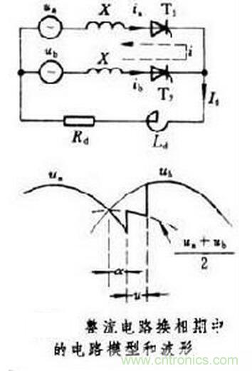 ③重疊導電現象和電壓降:圖5所示為變壓器漏抗存在時對整流電路波形的影響。當T1處於導通狀態,給直流側提供電流Id時,觸發T2,若ud<ub,則T2變為導通狀態。但由於交流側存在漏感,T2中的電流並不立即變為Id,T1中的電流也不立即降為零,因此出現T1和T2同時導通的狀態,這種狀態稱為換相重疊現象,這段時間以相角計算,稱換相重疊角,用u表示。在重疊期中,輸出電壓為(ud+ub)/2,與不考慮漏抗時相比,輸出電壓降低了(ub-ud)/2。重疊期內直流電流一定的話,則T1、T2回路中流過環流i,這時α相電流id=Id-i將逐漸減小,而b相電流ib=i,當ib增加到Id時,id就等於零,這樣就完成了換相過程。關於電流i,2&TImes;di/dθ=ub-ud式成立,由於在控製角α處i=0,在(α+u)處i=Id,故有2&TImes;Id=(ub-ud)·u。因此,交流電流在一周期內換相一次引起的平均輸出電壓降為dx=XId/2π。重疊角u隨α不同而不同,但電壓降是與α無關的常數。在三相橋式電路中,由於一周內換相6次,換相壓降nx=6XId/2π,式中X是每相的電抗。