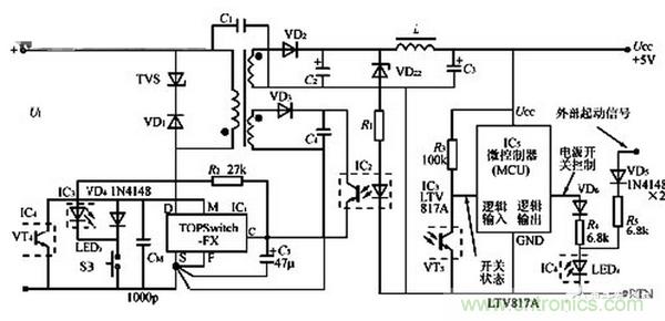 【導讀】開關電源部分主要由TOP Switch FX(IC1)、光耦合器(IC2)組成。控製電路則包括微控製器(MCU)、兩片LTV817A線性光耦合器(IC3、IC4)、按鈕開關SB。