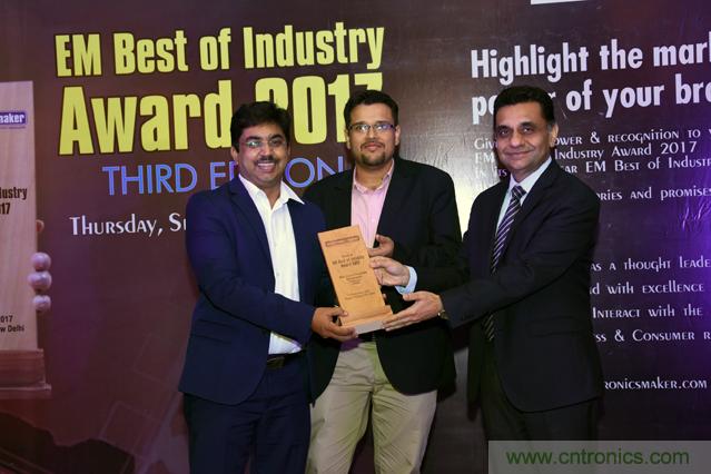 圖片說明:印度銷售經理Bharat Kapoor(左)以及印度和南非現場應用經理Navneet Vinaik(中)接受EM行業最佳獎的“最佳電路保護組件獎”。