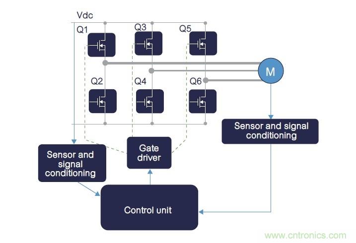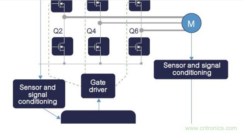 在電橋拓撲內,反向恢複過程從下橋臂開關(圖7中的Q2)續流結束時開始,到上橋臂開關(圖7中的Q1)開始導通時終止,且最終的恢複電流加到上橋臂電流內。連同上橋臂開關上的額外電流,下橋臂反向恢複過程與Vds≈0V到Vdc換向操作,可能會在下橋臂開關閘源電壓上產生雜散跳變電壓,因為下橋臂Ciss(輸入電容)是透過Crss(Miller電容)完成充電過程。