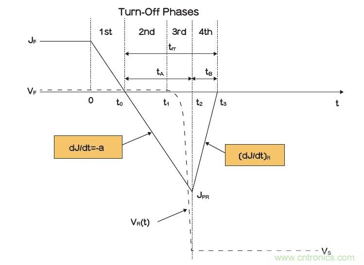 當二極管正向偏壓變成反向偏壓時,電流不會立即降至零值,因為消除通態期間儲存的電荷需要時間。因此,當t=t0時,二極管開始換向操作,電流開始下降,下降斜率(-a)恒定,外部電感和電源電壓是決定斜率的唯一因素。在t1之前,二極管被施加正向偏壓,從t1到t2,二極管壓降上升,達到電源電壓;在t=t2時,反向電流達到最大值。間隔(t3-t0)被稱為反向恢複時間(trr),而負電流與零線之間的區域是反向恢複電荷(Qrr)。tB期間的電流斜率主要與產品設計和矽特性有關。