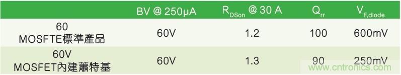 當隻有優化Qrr和VF,diode才能提高係統總體性能時,集成肖特基二極管的新60V MOSFET是一個正確選擇。圖3列出了標準MOSFET和集成肖特基的功率開關的主要電參數(兩款產品的BVDSS和芯片尺寸相同)。