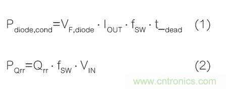 事實上,下橋臂體二極管導通損耗(Pdiode,cond)和反向恢複損耗(PQrr)與二極管正向壓降(VF,diode)及其反向恢複電荷(Qrr)密切相關: