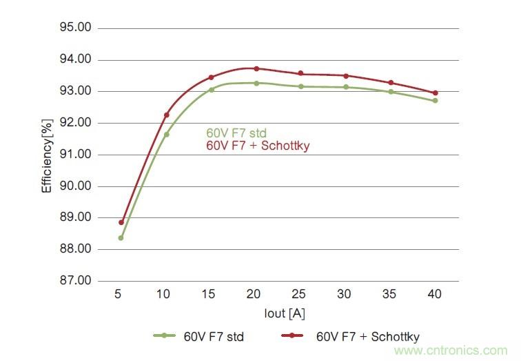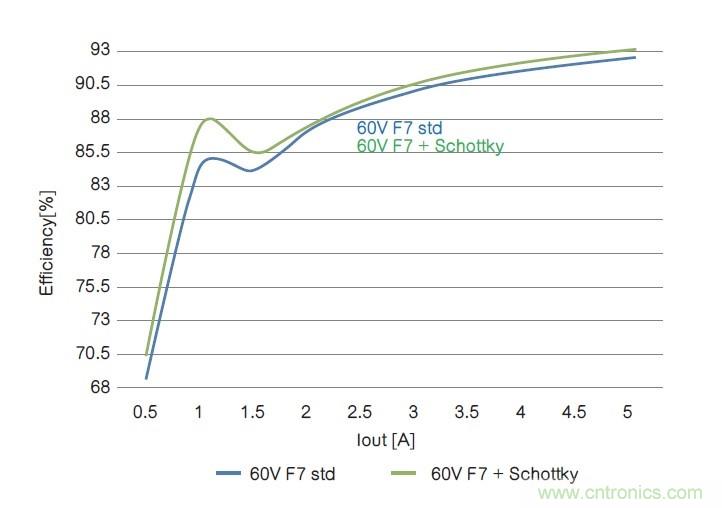 在兩個拓撲內,60V內置肖特基二極管的器件在整個電流範圍內性能表現更好,從而提高了係統總體性能。