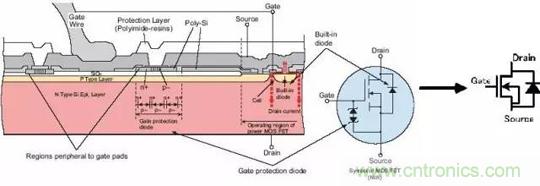 至於為什麼不使用耗盡型的MOS管,不建議刨根問底。對於這兩種增強型MOS管,比較常用的是NMOS。原因是導通電阻小且容易製造。所以開關電源和馬達驅動的應用中,一般都用NMOS。下麵的介紹中,也多以NMOS為主。在MOS管原理圖上可以看到,漏極和源極之間有一個寄生二極管。這個叫體二極管,在驅動感性負載(如馬達),這個二極管很重要。順便說一句,體二極 管隻在單個的MOS管中存在,在集成電路芯片內部通常是沒有的。下圖是MOS管的構造圖,通常的原理圖中都畫成右圖所示的樣子。 (柵極保護用二極管有時不畫)