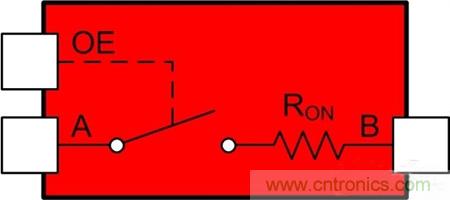 通過輸出使能引腳 (OE),用電壓來控製這個開關;隻需在高電平關閉開關,在低電平時打開開關。(對於低電平有效OE引腳來說,恰恰相反;這些引腳上通常會有標簽進行標注。)RON 是開關的內部電阻。A和B到開關的兩個連接點。