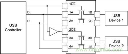 圖2顯示的是使用一個數字總線開關來將2個USB器件複用至單個USB控製器(USB2.0標準)的基本布局布線。在使用這個拓撲時,你每次隻能與一個器件通信。