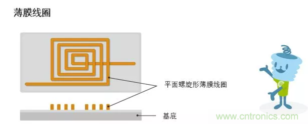 薄膜電感采用的是類似於IC製作的工藝,在基底上鍍一層導體膜,然後采用光刻工藝形成線圈,最後增加介質層、絕緣層、電極層,封裝成型。