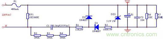 采用半波整流方式,根據計算式I1=0.5|I|=34500C可知,C=0.43uF。所以此處選用0.47uF的電容,反過來可以驗證提供的電流I1=34500C=16.2mA,多餘電流從穩壓管流過。