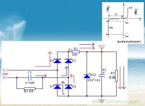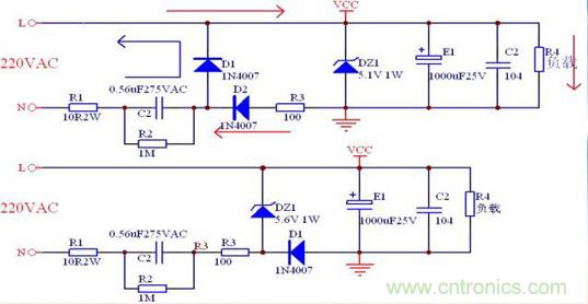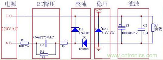 阻容降壓是一種利用電容在一定頻率的交流信號下產生的容抗來限製最大工作電流的電路。