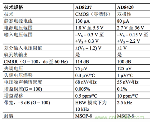 表 2 AD8237 和 AD8420 比較