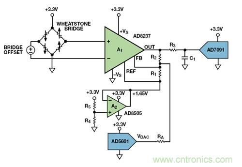 這個問題可通過圖 5 所示的電路來解決。電橋放大器A1是一個像AD8237 一樣的ICF儀表放大器。放大器A2,帶R4 和R5,將A1的零電平輸出設為中間電源。AD5601 8 位DAC對輸出進行調整,通過RA使電橋失調為 0。然後,放大器的輸出由AD7091微功耗 12 位ADC數字化。
