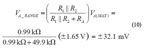 由於 DAC 可以擺動±1.65 V,因此,總失調調整範圍可通過由 RA以及 R1和 R2的並聯組合形成的分壓器給定,其計算方法如下:
