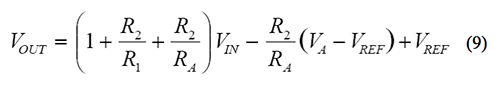 如果相對於原始等式中的 VREF 取 VOUT 和 VA,則可得到相同的結果。VA(MAX) – VREF 也應替換等式(7)中的 VA(MAX)。