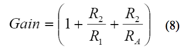 其中,VIN(MAX)為傳感器預期的最大失調。等式(5)同時顯示,調整電路的插入會修改從輸入到輸出的增益。即使如此,其影響一般也很小,增益可以重新計算為: