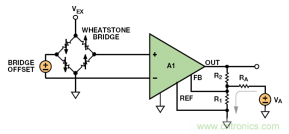 例如,在各元件的容差均為 0.1%且激勵電壓為 5 V 時,差分失調可以高達±5 mV。如果需要 400 的增益來實現所需電橋靈敏度,則放大器輸出端的失調變成±2 V。假設放大器由同一電源驅動,並且其輸出可以軌到軌擺動,則僅電橋失調就可能消耗掉 80%以上的輸出擺幅。在行業要求電源電壓越來越小的趨勢下,這個問題隻會變得更加糟糕。