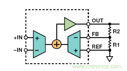 間接電流反饋(ICF)儀表放大器(如AD8237和AD8420)可在放大之前移除失調。圖 3 顯示ICF拓撲結構原理圖。