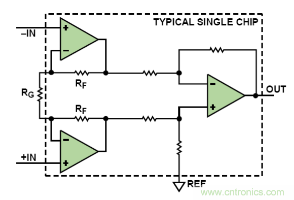 傳統的三運放儀表放大器架構(如圖 2 所示)有you一yi個ge差cha分fen增zeng益yi級ji,其qi後hou為wei一yi個ge減jian法fa器qi,用yong於yu移yi除chu共gong模mo電dian壓ya。增zeng益yi施shi加jia於yu第di一yi級ji,因yin此ci,失shi調tiao放fang大da的de倍bei數shu與yu目mu標biao信xin號hao相xiang同tong。因yin此ci,將jiang其qi移yi除chu的de唯wei一yi方fang法fa是shi在zai參can考kao(REF)端施加反電壓。這種方法的主要不足在於,如果放大器的第一級已經飽和,則調節 REF 上的電壓並不能更正失調。克服這點不足的幾種方法包括: