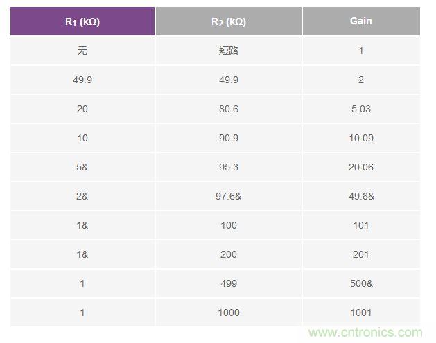 表 1 各種增益的推薦電阻(1%電阻)