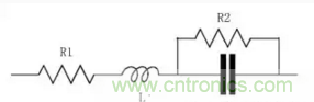片狀電容在射頻電路中的應用十分廣泛,它可以用於濾波器調頻、匹配網絡、晶體管的偏置等很多電路中,因此很有必要了解它們的高頻特性。電容的高頻等效電路如圖所示,其中L為引線的寄生電感;描述引線導體損耗用一個串聯的等效電阻R1;描述介質損耗用一個並聯的電阻R2。