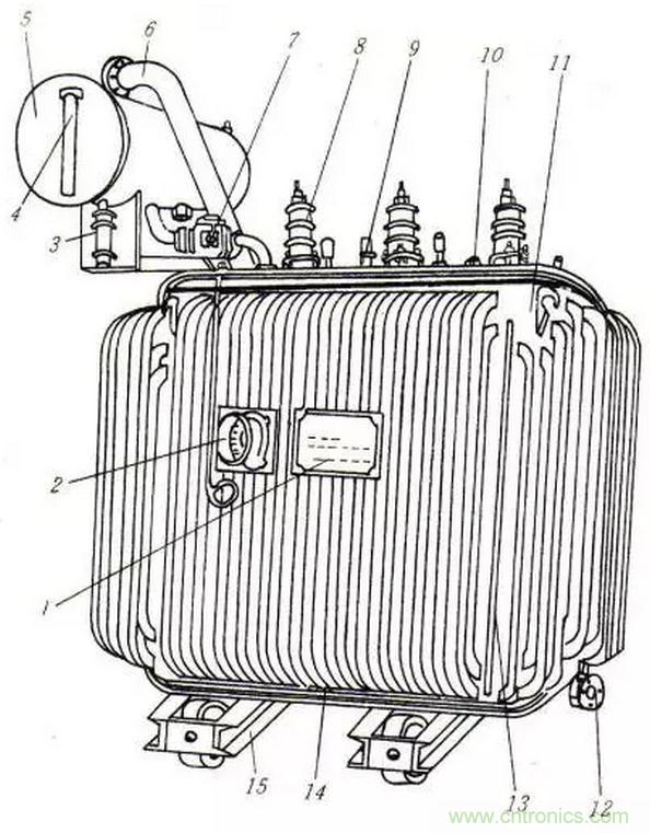 1-銘牌;2-信號式溫度計;3-吸濕器;4-油標;5-儲油櫃;6-安全氣道;7-氣體繼電器;8-高壓套管;9-低壓套管;10-分接開關;11-油箱;12-放油閥門;13-器身;14-接地板;15-小車;16壓力釋放閥(補充:圖左上側)
