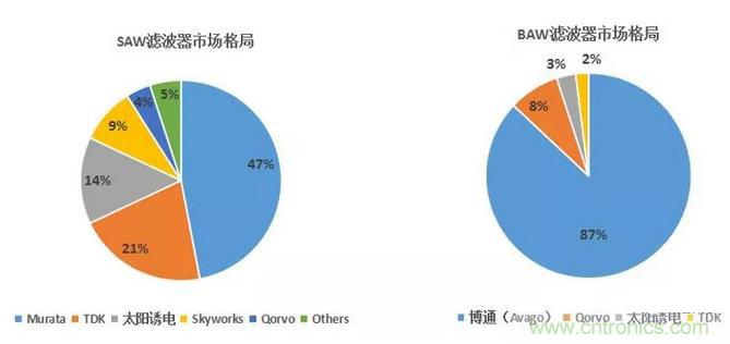 從全球範圍來看,SAW濾波器的主要供應商包括TDK-EPCOS、Murata(村田)和太陽誘電,三者合計占據了全球82%的市場份額。BAW濾波器的主要供應商包括Avago及Qorvo(Triquint),兩者占據了全球95%以上的市場份額。
