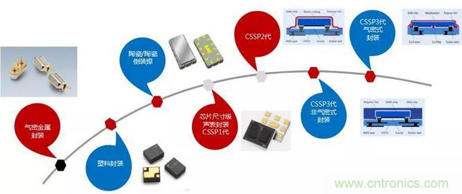 SAW器件封裝要求:(1)器件有源表麵必須有一定空間;(2)襯底和封裝材料必須有良好的熱匹配;(3)防止濕氣浸人和微粒沾汙。先後經曆過氣密金屬封裝、塑料封裝、陶瓷封裝、陶瓷倒裝焊、芯片尺寸級聲表封裝CSSP等幾個階段,針對不同的客戶需求和應用場景這些封裝方案依然共存,但是器件的小型化是大勢所趨。