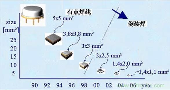 2)改進器件的封裝形式,現在已經由傳統的圓形金屬殼封裝改為方形或長方形扁平金屬封裝或LCCC(無引線陶瓷芯片載體)表麵貼裝的形式,采用體積更小的CSP封裝形式,目前封裝尺寸已做到1.1mm x 0.9mm;