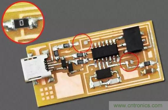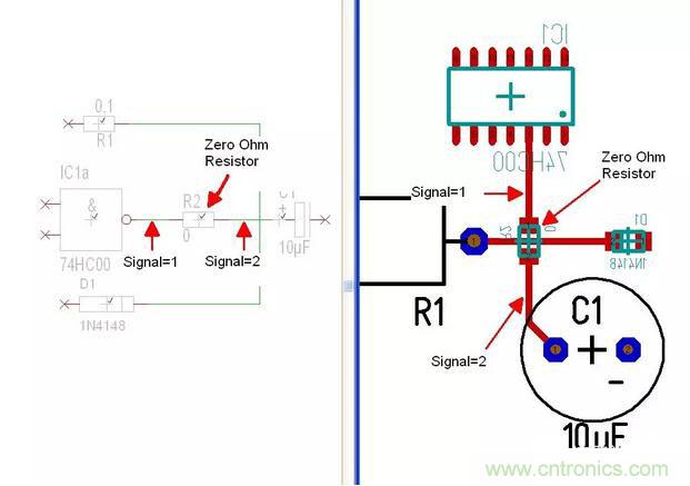 如(ru)果(guo)老(lao)板(ban)出(chu)於(yu)成(cheng)本(ben)考(kao)慮(lv),讓(rang)你(ni)設(she)計(ji)一(yi)個(ge)單(dan)麵(mian)板(ban),也(ye)就(jiu)是(shi)說(shuo)你(ni)的(de)元(yuan)器(qi)件(jian)的(de)安(an)裝(zhuang)以(yi)及(ji)走(zou)線(xian)都(dou)隻(zhi)能(neng)在(zai)一(yi)麵(mian),你(ni)最(zui)頭(tou)疼(teng)的(de)是(shi)有(you)些(xie)線(xian)實(shi)在(zai)走(zou)不(bu)過(guo)去(qu),必(bi)須(xu)跨(kua)線(xian)連(lian)接(jie),打(da)倆(liang)孔(kong)用(yong)跳線?如ru果guo在zai研yan發fa的de時shi候hou還hai可ke以yi,但dan有you一yi天tian你ni的de設she計ji變bian成cheng了le產chan品pin需xu要yao大da批pi量liang生sheng產chan了le,機ji器qi折zhe騰teng起qi跳tiao線xian來lai要yao比bi放fang置zhi一yi個ge電dian阻zu麻ma煩fan的de多duo了le,這zhe時shi候hou0Ω的電阻就幫你大忙了,根據你的空間,你可以選用0805、0603或0402的電阻。
