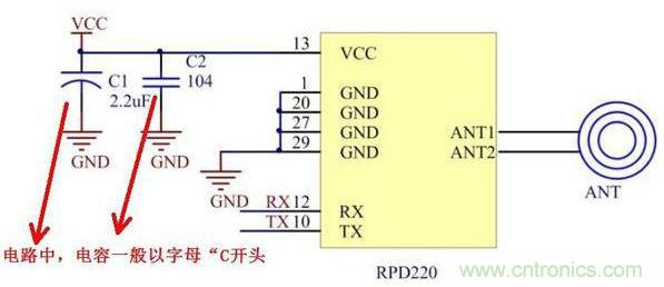 電容在電路中的標識一般以字母“C”開頭,在“C”的後麵敷以數字,以表示電容在電路中的序號,例如圖中的C103,C104.就是指這個電路中的第103個,104個電容。