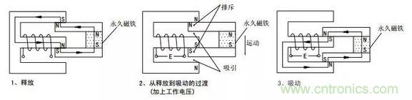 由永久磁鐵保持釋放狀態,加上工作電壓後,電磁感應使銜鐵與永久磁鐵產生吸引和排斥力矩,產生向下的運動,最後達到吸合狀態。