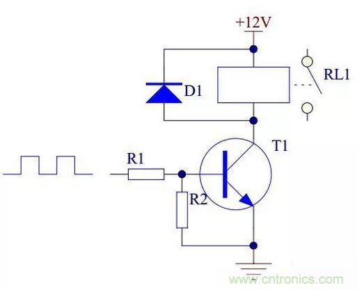 電路中各元器件的作用:晶體管T1為控製開關;電阻R1主要起限流作用,降低晶體管T1功耗;電阻R2使晶體管T1可靠截止;二極管D1反向續流,為三極管由導通轉向關斷時為繼電器線圈中的提供泄放通路,並將其電壓箝位在+12V上。