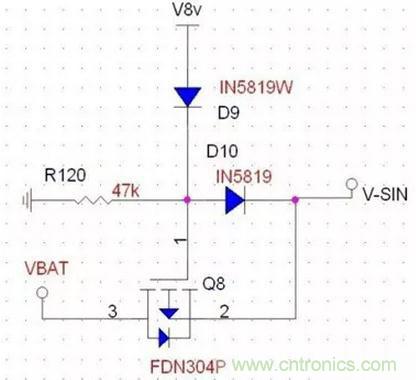 由PMOS來進行電壓的選擇,當V8V存在時,此時電壓全部由V8V提供,將PMOS關閉,VBAT不提供電壓給VSIN,而當V8V為低時,VSIN由8V供電。注意R120的接地,該電阻能將柵極電壓穩定地拉低,確保PMOS的正常開啟,這也是前文所描述的柵極高阻抗所帶來的狀態隱患。D9和D10的作用在於防止電壓的倒灌。D9可以省略。這裏要注意到實際上該電路的DS接反,這樣由附生二極管導通導致了開關管的功能不能達到,實際應用要注意。