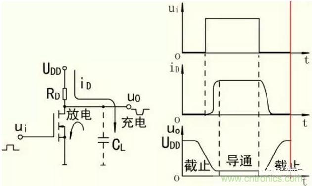 當輸入電壓ui由高變低,MOS管由導通狀態轉換為截止狀態時,電源UDD通過RD向雜散電容CL充電,充電時間常數τ1=RDCL,所以,輸出電壓uo要通過一定延時才由低電平變為高電平。