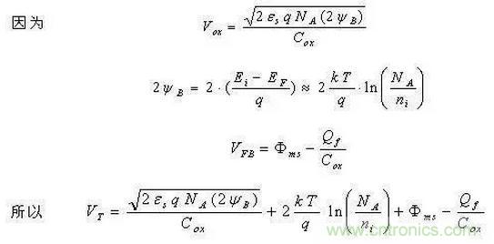 在閾值電壓的表示式中,與摻雜濃度和溫度有關的因素主要是半導體Fermi勢ψB。當p型半導體襯底的摻雜濃度NA提高時,半導體Fermi能級趨向於價帶頂變化,則半導體Fermi勢ψB增大,從而就使得更加難以達到ψs≥2ψB的反型層產生條件,所以閾值電壓增大。