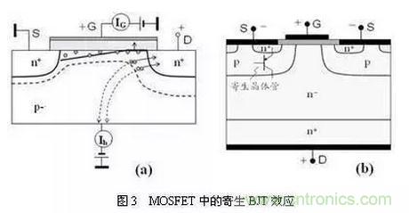 ③對於VDMOSFET:觀察圖3(b)中的結構,即可見到,當器件正向導通時,其中存在一個工作於放大狀態的寄生n-p-n晶體管(n+源區是發射區,n-外延層是集電區,p溝道是基區)。該寄生晶體管的可能導電通道是與MOSFET的ID相並聯的,故在VDMOSFET工作時,必須要注意防止寄生晶體管導通;否則,寄生晶體管的導通就可能引起二次擊穿,使得功率MOSFET完全失去功能。