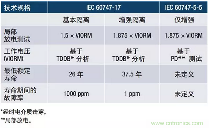 IEC 60747-17 (DIN V VDE V 0884-11)明確定義了采用感性和容性技術的絕緣,而公認的IEC 60747-5-5標準則被用來定義采用光耦合器技術的絕緣。然而,IEC 60747-5-5沒有規定通過TDDB分(fen)析(xi)來(lai)確(que)定(ding)連(lian)續(xu)工(gong)作(zuo)電(dian)壓(ya)和(he)使(shi)用(yong)壽(shou)命(ming)。它(ta)依(yi)賴(lai)局(ju)部(bu)放(fang)電(dian)電(dian)壓(ya)測(ce)試(shi)來(lai)確(que)定(ding)工(gong)作(zuo)電(dian)壓(ya),但(dan)並(bing)未(wei)定(ding)義(yi)器(qi)件(jian)的(de)工(gong)作(zuo)壽(shou)命(ming)。因(yin)此(ci),感(gan)性(xing)和(he)容(rong)性(xing)技(ji)術(shu)的(de)最(zui)低(di)額(e)定(ding)壽(shou)命(ming)為(wei)37.5年,而對光耦合器隔離器則未作規定。