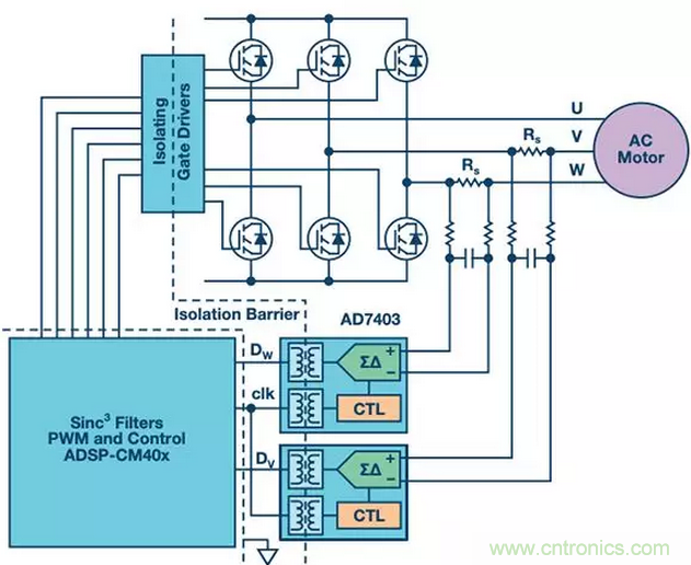 圖1所示為一個典型三相永磁電機驅動係統,其利用檢測電阻測量繞組電流,並通過ADI公司的AD7403隔離式Σ-Δ調製器和sinc3濾波器提供反饋。AD7403使用單個二階調製器數字化電路來將檢測電阻的模擬信號轉換為隔離的一位數字脈衝流,其大小取決於滿量程輸入電壓範圍。然後,sinc3濾波器提取電流平均值,同時消除逆變器開關產生的噪聲。其存儲器可以存儲一個代表電流的16weizhengshu,yucitongshi,takeyijianggaishuzhiyuyigedaibiaodianliuxianzhidejizhunzhixiangbijiao,ruguofashengguozai,tajiuhuitongguodandudeyinjiaofasongjingbao。liyonggengduandelvboqijiankongguozai,bingjiangqiyucelianglvboqibinglian,keyisuoduanjingbaoyanchishijian。