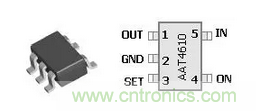 我們仍以AAT4610為例,說明電子開關實現過流保護的工作原理。AAT4610采用SOT-23塑料封裝(如圖1),5個引腳的定義見表1。