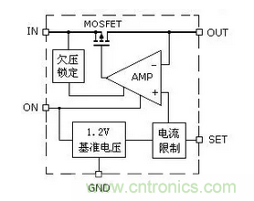 AAT4610將6V/2A的P溝道MOSFET場效應管與柵極驅動器、電壓基準、限流比較器和欠壓閉鎖電路組合在SOT-23-5封裝中(如圖2)。其中MOSFET是一個電子開關,它的通斷受比較器輸出電壓的控製,如果輸出電流大於設定電流,運算放大器AMP輸出負電壓,關斷MOSFET,停止電壓輸出,對供電電路起到保護作用。MOSFET的溝道電阻最大值僅為180mΩ,關斷模式下靜態電流為1mA。MOSFET的工作電壓為2.7V~5.5V,輸入電壓低於2.7V時,由欠壓鎖定電路關斷MOSFET,對供電電路進行欠壓保護。
