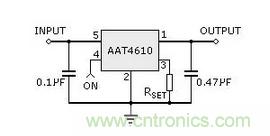 AAT4610的應用電路十分簡單,隻要外接兩隻濾波電容和一隻電阻器RSET,便可實現過流保護功能,如圖3。