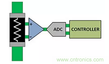 結合這些因素,針對電流監控的常用信號鏈配置會涉及到一個用於放大分流電阻器兩端電壓的模擬前端、一個將放大的電壓轉換為數字信號的ADC,以及一個係統控製器(圖 1)。