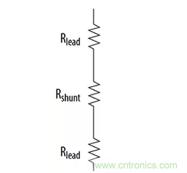 圖2:雙端子分流電阻器有三個串聯電阻:實際分流電阻器的電阻、電阻器兩根引線的電阻以及電阻器連接的印刷電路板上的引線或印製線的電阻(未顯示)。引線電阻可能在高電流測量中導致測量誤差。(圖片來源:Bourns)