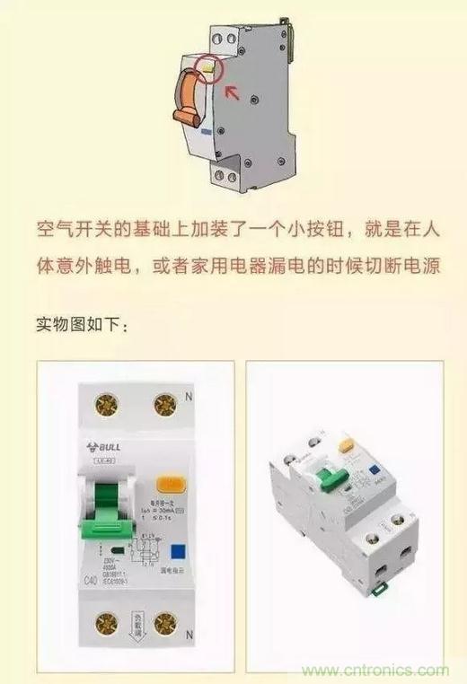 漏電斷路器是在空氣開關的基礎上添加的一個小按鈕,當發生意外漏電的時候,會引發開關自動切斷電源。