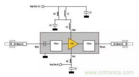 許多集成了線性線路的RF芯(xin)片(pian)對(dui)電(dian)源(yuan)的(de)噪(zao)音(yin)非(fei)常(chang)敏(min)感(gan),通(tong)常(chang)每(mei)個(ge)芯(xin)片(pian)都(dou)需(xu)要(yao)采(cai)用(yong)高(gao)達(da)四(si)個(ge)電(dian)容(rong)和(he)一(yi)個(ge)隔(ge)離(li)電(dian)感(gan)來(lai)確(que)保(bao)濾(lv)除(chu)所(suo)有(you)的(de)電(dian)源(yuan)噪(zao)音(yin)。一(yi)塊(kuai)集(ji)成(cheng)電(dian)路(lu)或(huo)放(fang)大(da)器(qi)常(chang)常(chang)帶(dai)有(you)一(yi)個(ge)開(kai)漏(lou)極(ji)輸(shu)出(chu),因(yin)此(ci)需(xu)要(yao)一(yi)個(ge)上(shang)拉(la)電(dian)感(gan)來(lai)提(ti)供(gong)一(yi)個(ge)高(gao)阻(zu)抗(kang)RF負載和一個低阻抗直流電源,同樣的原則也適用於對這一電感端的電源進行去耦。