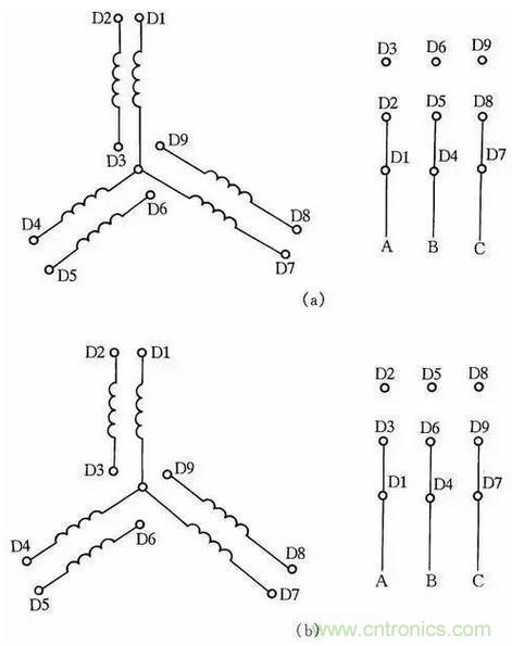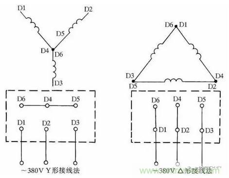 一般常用三相交流電動機接線架上都引出6個接線柱,當電動機銘牌上標為Y形接法時,D6、D4、D5相連接,D1~D3接電源;為△形接法時,D6與D1連接,D4與D2連接,D5與D3連接,然後D1~D3接電源。可參見圖1所示連接方法連接。