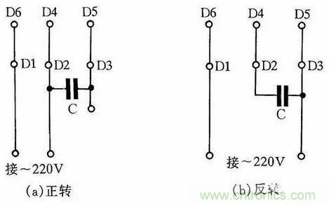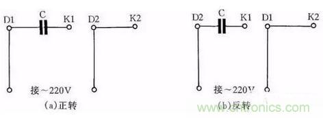 圖4是JX07A-4型單相電容運轉電動機接線方法。電動機功率為60W,用220V/50Hz交流電源、電流為0.5A。它的轉速為每分鍾1400轉。電容選用耐壓400~500V、容量8μF的產品。圖4(a)為正轉接線,圖4(b)為反轉接線。