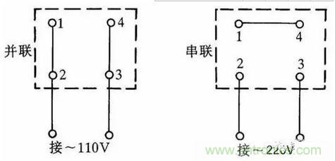 有的單相吹風機引出4個接線端子,接線方法如圖5所示。采用並聯接法應接入110V交流電源,采用串聯接法應接入220V交流電源。