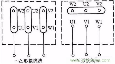 目前,Y係列電動機被廣泛應用。Y係列電動機具有體積小、外形美觀、節電等優點。它的接線方式有兩種:一種為△形,它的接線端子W2與U1相連,U2與V1相連,V2與W1相連,然後接電源;另一種為Y形,接線端子W2、U2、V2相連接,其餘3個接線端子U1、V1、W1接電源。接線見圖6。